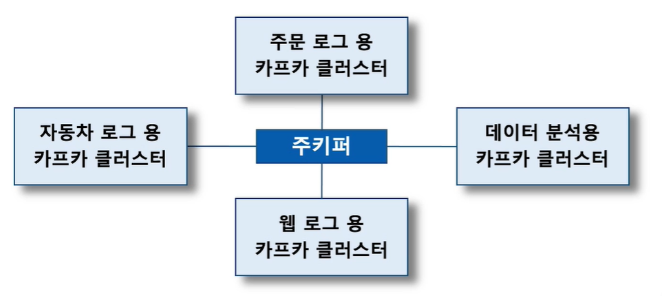 카프카 클러스터를 상황에 따라 분리해서 데이터를 격리할 수 있습니다. 한 개의 주키퍼에 주문 로그, 데이터 분석, 웹 로그 등과 같이 목적에 따라 나누는 것도 좋은 방법일 수 있습니다. 하지만 주키퍼가 데이터를 많이 저장하고 통신량이 많아지면 병목 지점이 될 수 있다는 부분을 유의해야 합니다.