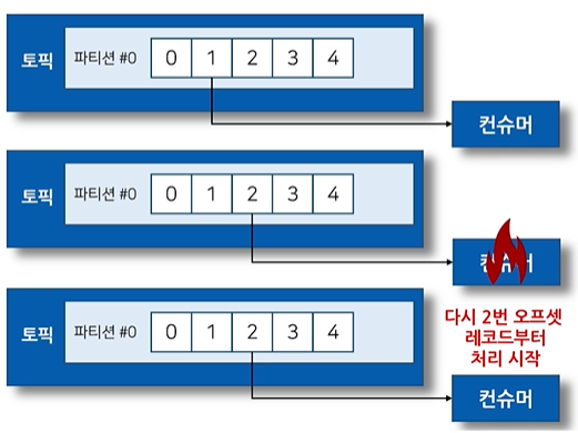 컨슈머는 오프셋 커밋을 통해서 데이터를 어디까지 처리했는지 저장합니다. 예를들어 컨슈머가 파티션#0의 1번 오프셋 레코드를 처리 완료하면, 컨슈머는 "커밋"이라는 명령어를 통해 1번까지 처리했고, 다음 처리할 레코드는 2번이라는 것을 알 수 있습니다. 그리고 2번 오프셋 레코드를 처리하는 도중 이슈가 발생하면, 마지막 커밋이 된 오프셋이 1번임을 보고 2번 레코드부터 다시 처리를 시작합니다.