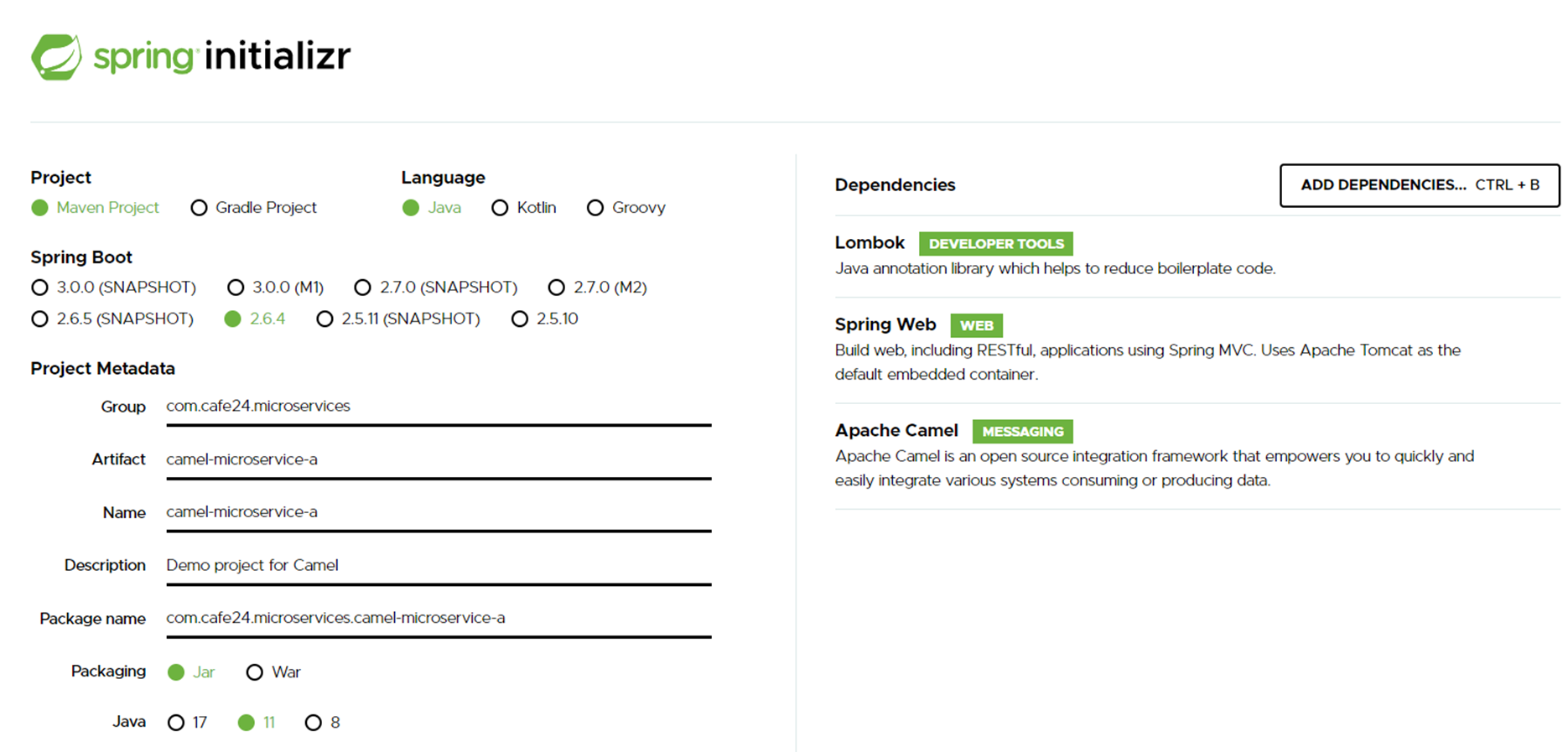 - Spring Web, Apche Camel, MySQL Driver dependency 추가
